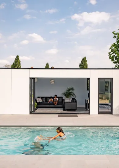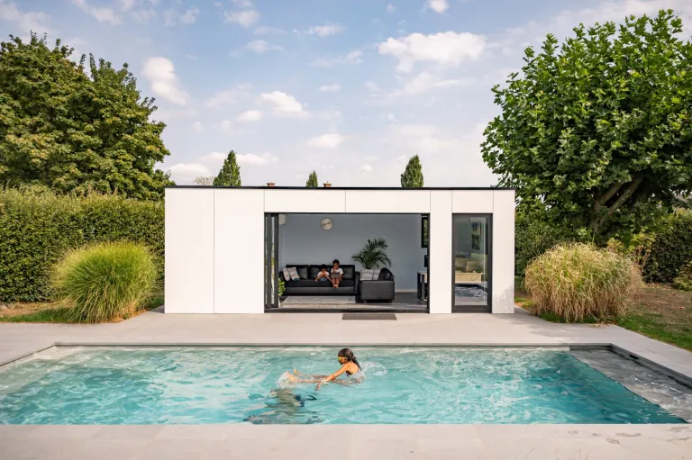 Een poolhouse op maat biedt niet alleen comfort, maar ook rust en privacy. Plaats het zo dat je een mooi zicht hebt op het zwembad, zonder inkijk van buren. Zo ontstaat een harmonieus geheel waarin architectuur en buitenruimte elkaar versterken.