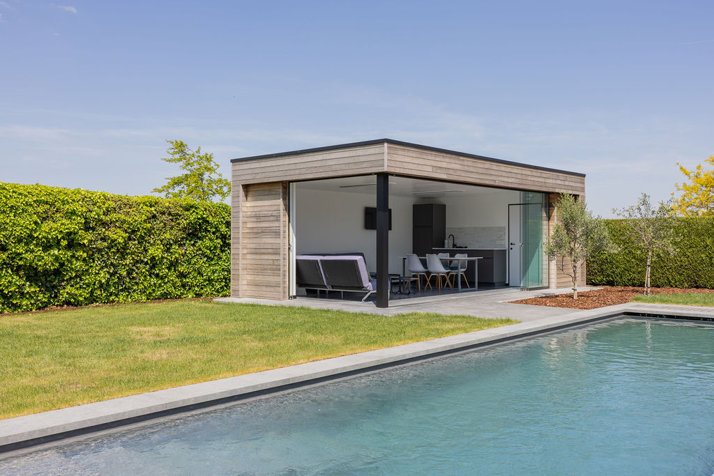 Een goed ontwerp houdt rekening met droge en natte zones. Denk aan een overdekte loungehoek, doucheruimte of technische berging. Zo blijft alles functioneel en gebruiksvriendelijk, zonder in te boeten aan esthetiek.